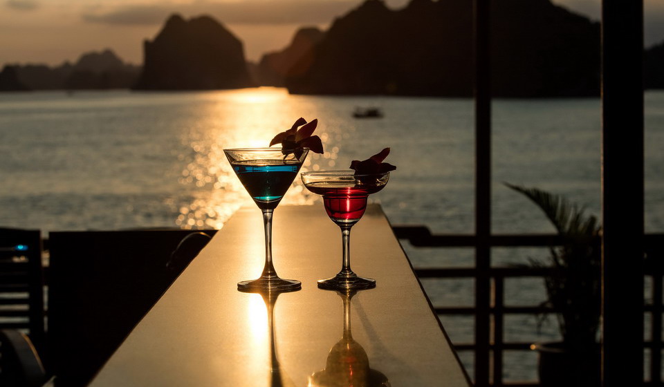 • Option: Massage service available. Please book with Cruise Manager directly (please see massage menu)Attend the Cooking class on sundeck – How to make Vietnamese spring rolls – traditional Vietnamese food. Then enjoy Happy Hour (Buy one drink-get one free). It is time for chit chat and relaxing. Watch the magnificent sunset over Halong Bay.