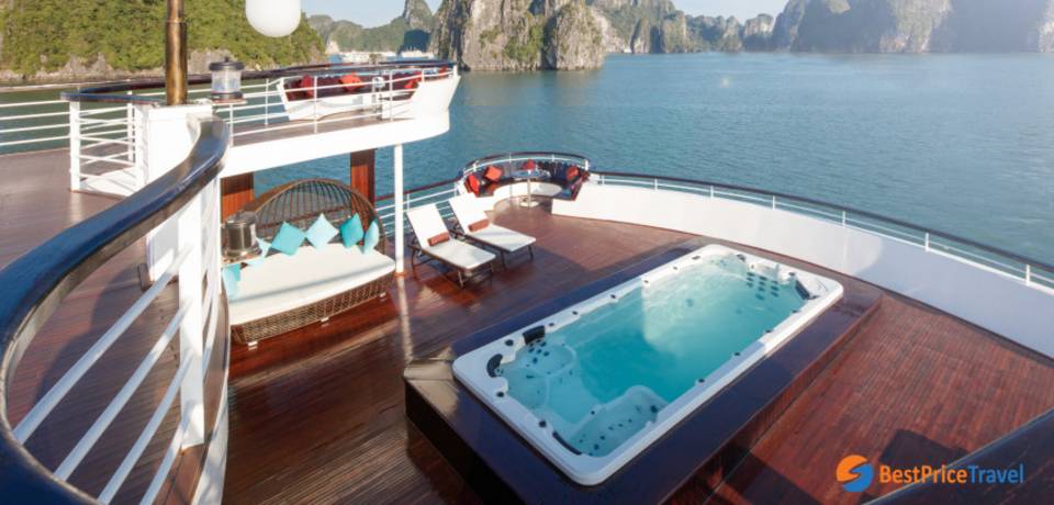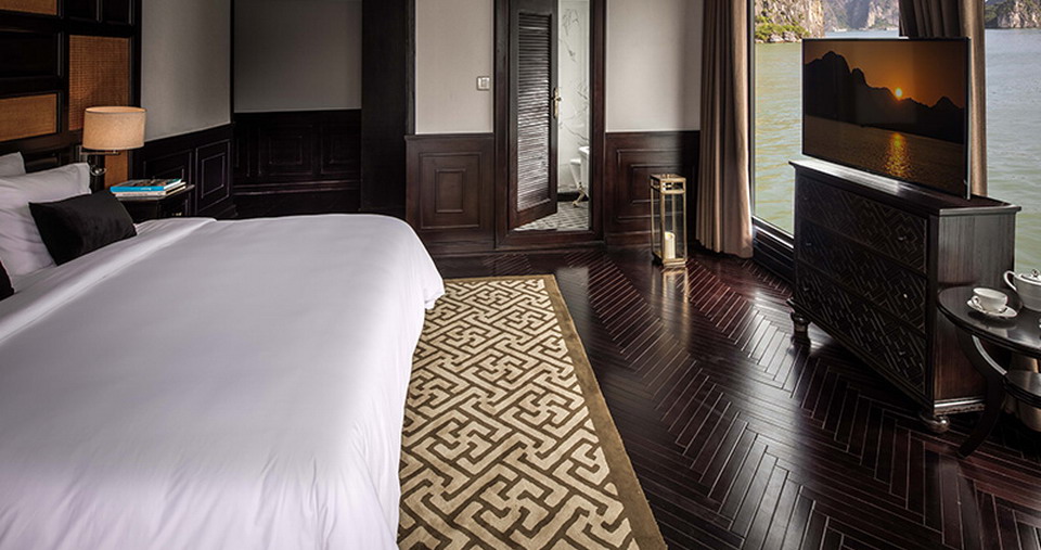 Cabinet Suite: Non-smoking, located on the Upper Deck at back of the ship with the size of 35 m2, features either a Double bed or two Single beds, two large window with sea view and private terrace. Also includes an en-suite bathroom with bathtub, shower, sink, WC, hair-dryer, bath linen, slippers and toiletries.