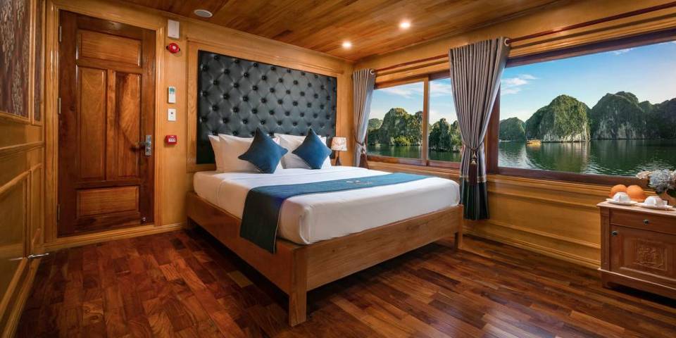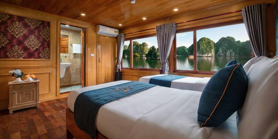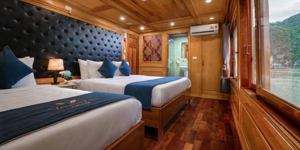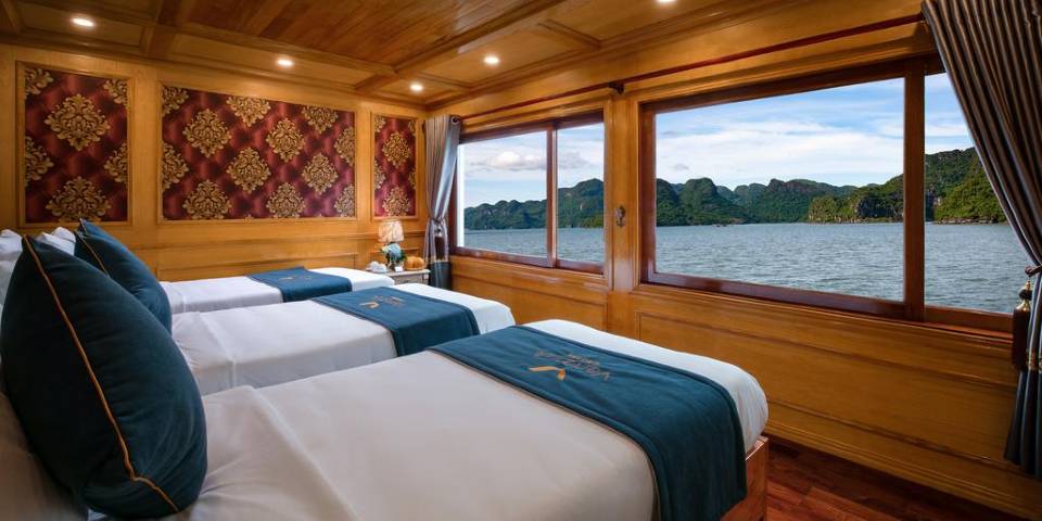 Located on the first deck of the cruise and offer the space of 25m2, the cabins come with 3 single beds (1,0m x 2m for each bed) or 1 double bed (2.0m x 2.0m) and 1 single bed (1,0m x 2m). This type of cabin is a perfect choice for family or group of friends 3 people . En-suite bathroom is also sophisticatedly equipped with standing shower, high quality amenities and more.. Email:veneziacruise@impresstravel.com & call to Mr. Alex Impress Travel, Lan Ha Bay Tours, Lan Ha Bay Cruises & Venezia Cruise Manager at his cell-phone (+84) 9123 79 189 ​