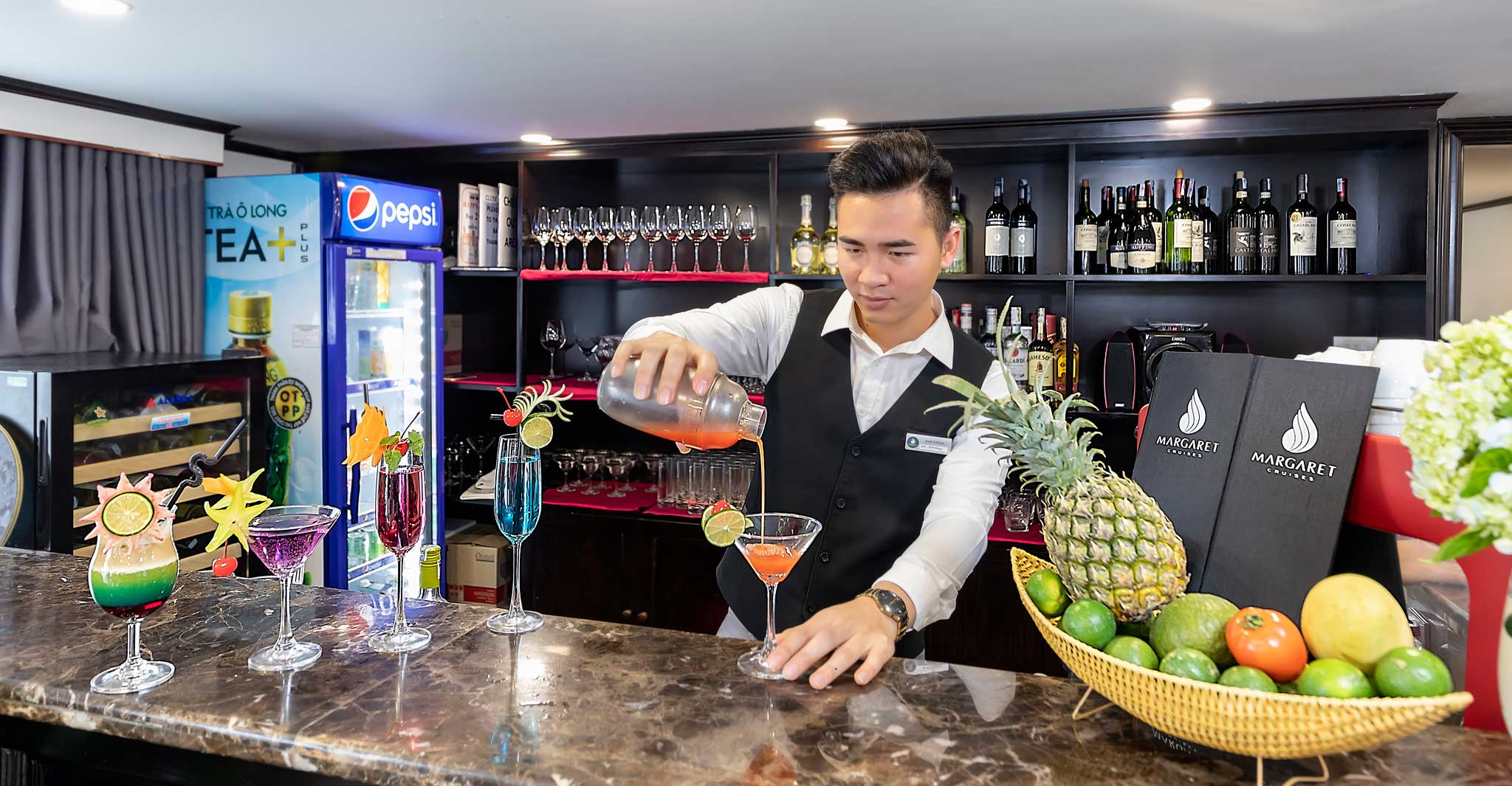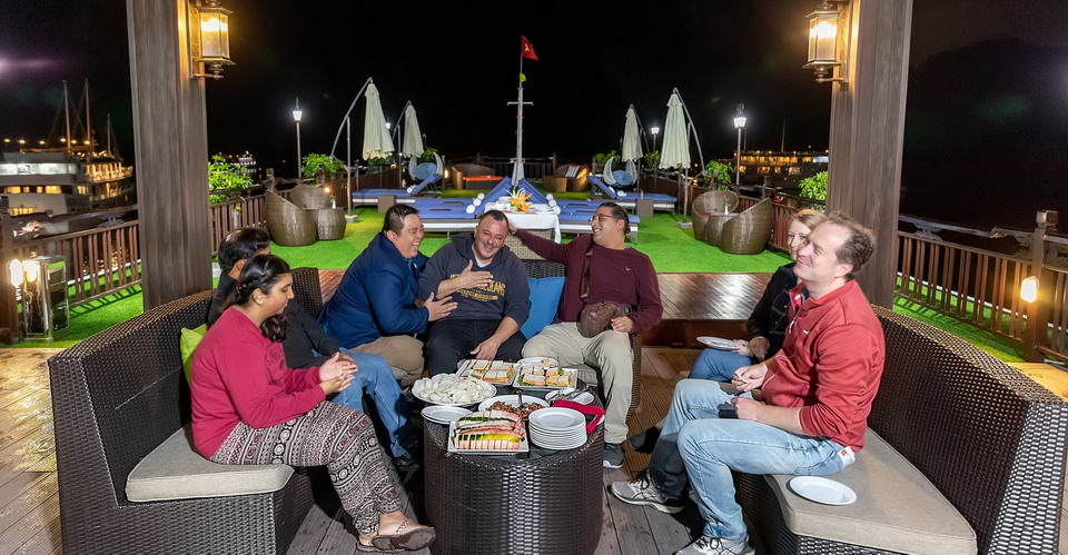 • 18:00 Enjoy Sun Set party with fruits and snacks on Margaret Sky Bar.This time is regarded as “Happy Hour” – “buy two get one” while our cruise is sailing to the overnight anchorage.