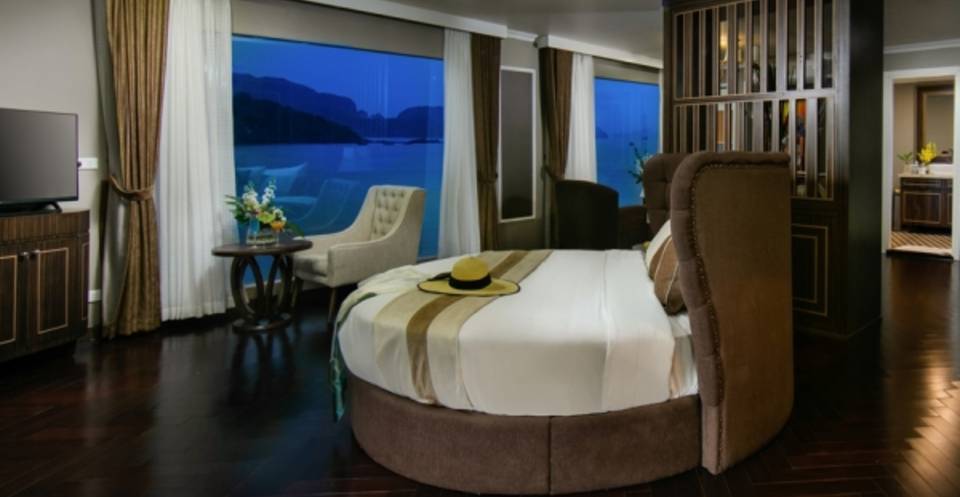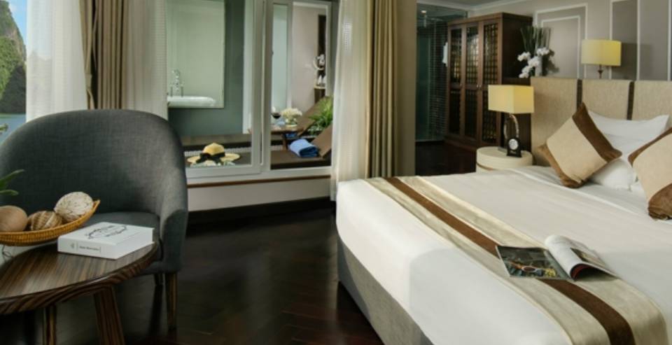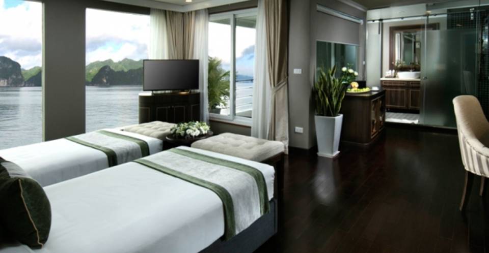 Perfectly positioned in forefront of the cruise (middle deck), the 55-meter-square family suite is capable to accommodate a big family with a double bed (1.6m x 2.0m) and a single bed (1.1m x 2.0m), which is convertible to one super king size bed (2,7×2 m). The cozy ambiance of hardwood floors and classically elegant interiors is expanding to the sizeable sun terrace of 13 m2, providing sunbathing beds, swing, dining table of four, and even an evergreen tropical vegetation onboard. The cabin itself will appeal the most fastidious people to lay down on peace, leaving space for little children to play games or watching blockbuster movies on the flat-screen HD TV and other high-tech entertainment – an absolute feeling of a home away from home. Email: eracruise@impresstravel.com& call to Mr. Alex Impress Travel, Lan Ha Bay Tours, Lan Ha Bay Cruises & Era Cruise Manager at his cell-phone (+84) 9123 79 189 ​