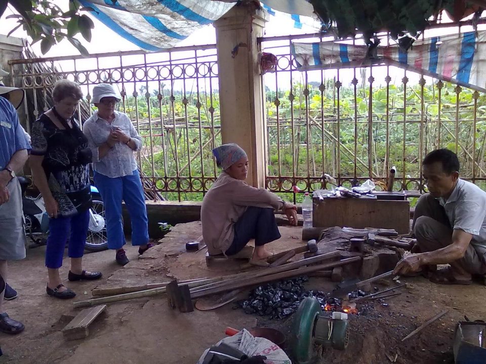 • You leave Hanoi center and drive to the west of city. It is about 17 km = 35 minutes. Upon arrival, meet the local host. Firstly, you will visit a local market since Le King Dynasty. It is the most famous market in the region where many traditional items for sales. If on market days, people from all the surrounding villages would come to trade. People bring dogs, cats, pigs, chickens, ducks, and bamboo baskets to sell. Everyone is excited to meet each other on that day. You will be surprised about bustling and colorful market which is working under the canopy of old tree. You will see the old woman chew betel and areca nut and blacksmiths work hard with his bright brazier. Right next to the market place is nice vegetable farms. We take a tour around vegetable fields growing a variety of produce including: cauliflower, cabbage, tomatoes, green peas, snake peas and corn, as well as fruit gardens with oranges, pomelos, papaya and more., and you may have chance to join with a farmer working in his field.