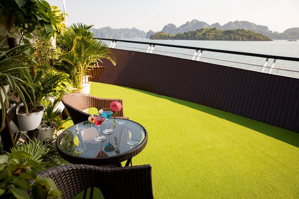 Honeymoon Suite Sea View with Terrace Doris Cruise with the contemporary style with wooden flooring, expansive windows, and newly updated equipment . Doris Cruise will desire to give fabulous and perfect services to the passengers. Email:doriscruise@impresstravel.com & call to Mr. Alex Impress Travel, Lan Ha Bay Tours, Lan Ha Bay Cruises & Doris Cruise Manager at his cell-phone (+84) 9123 79 189 ​