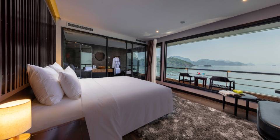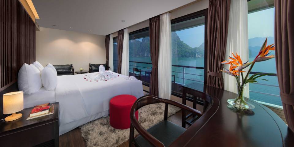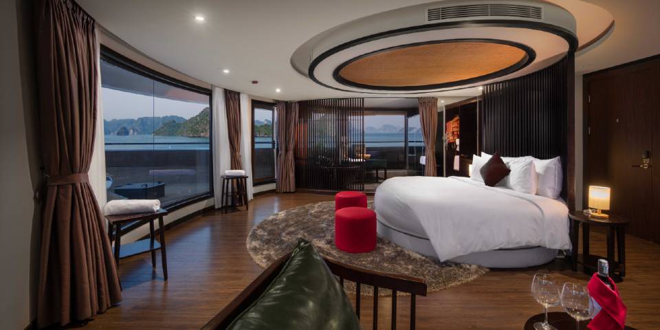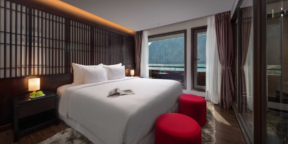 Relax in splendid comfort in this beautifully-designed 60m2 suite for guests who want to enjoy their cruise with a feeling of fine quality and private space. One outstanding feature of the room is a terrace with additional sunbed – a perfect spot for relaxing outdoors and savouring the views with a book or cocktail in peaceful seclusion, located as it is at the end of the deck. The room includes full-size viewing windows, adjoining bathroom with bathtub and shower and unique art and decor. Email:scarletpearlcruise@impresstravel.com & call to Mr. Alex Impress Travel, Lan Ha Bay Tours, Lan Ha Bay Cruises & Scarlet Pearl Cruise Manager at his cell-phone (+84) 9123 79 189 ​