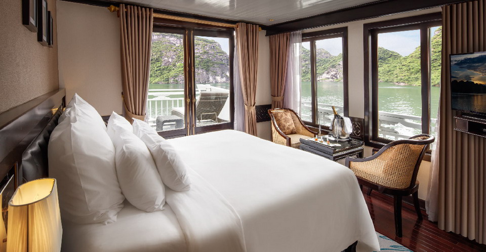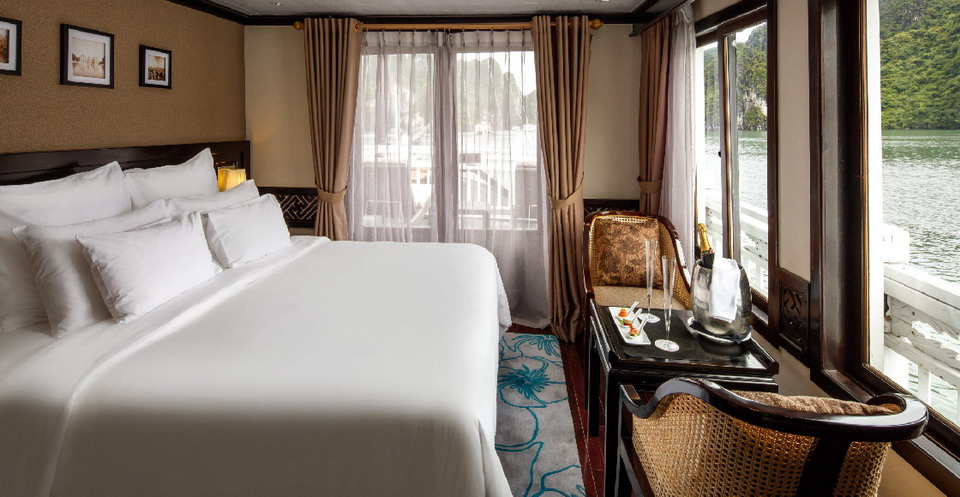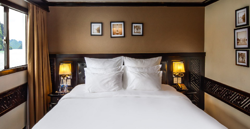 Paradise Suite Cabin is the largest cabin on the lower deck of the Paradise Luxury. Taking comfort to the next level, each suite is roomy and impeccably decorated, and includes all the amenities, features of the Deluxe Cabin as well as an 80cm LCD TV, DVD player and mini-bar. Cabin location: Main deck, Average room size: 23m², LCD 80cm TV, DVD player, Mini-bar, Bathrobe.Email: paradisecruise@impresstravel.com & call to Mr. Alex Impress Travel, Halong Tours, Halong Bay Cruises & Paradise Cruise Manager at his cell-phone (+84) 9123 79 189
