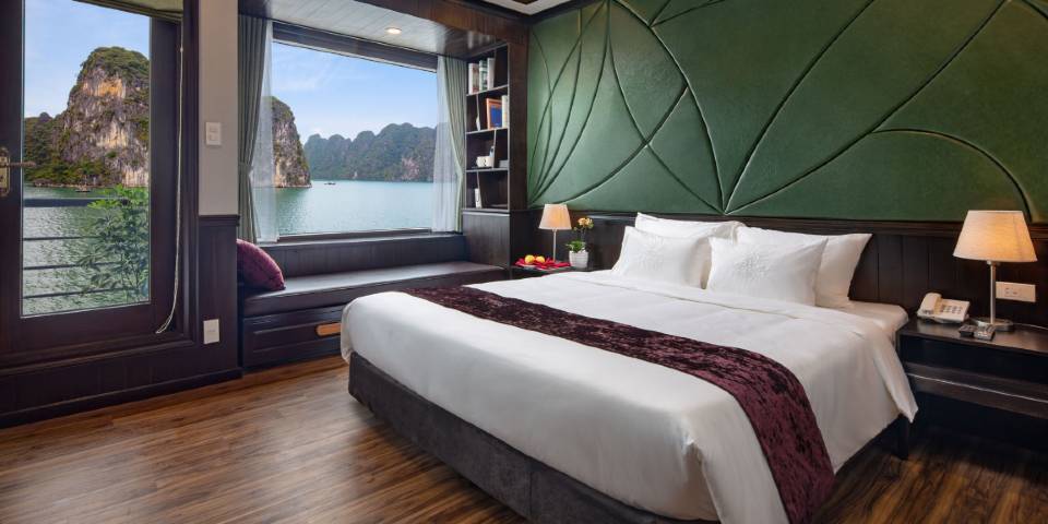 These luxurious cabins are situated on the second floor with private balcony where lovely views of the legend bays are appeared even more beautiful in your eyes once you get into the cabins. Premium Deluxe Cabins are perfectly designed with luxury and elegance. The lifetime experiences are absolutely save in your mind as well as the magnificent cabins are printed as the highlight of your journey in Viet Nam. The plus point of cabins are handmade wooden decoration which curved by the skillful and professional Vietnamese artisans. Email:peonycruise@impresstravel.com & call to Mr. Alex Impress Travel, Lan Ha Bay Tours, Lan Ha Bay Cruises & Peony Cruise Manager at his cell-phone (+84) 9123 79 189 ​