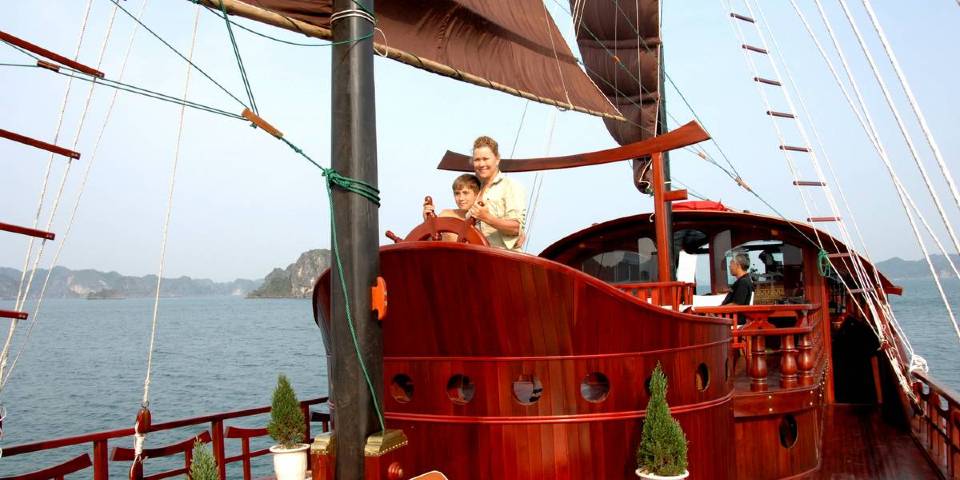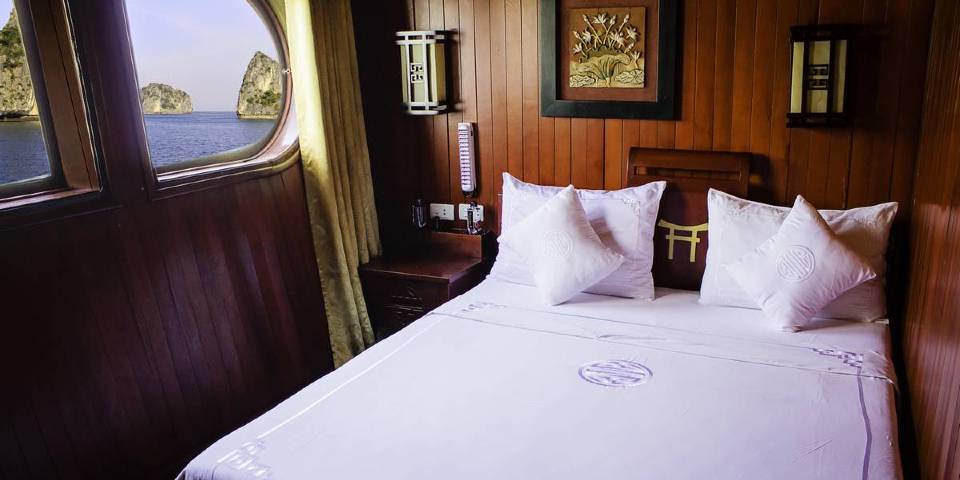Red Dragon cruise has 5-CABIN AUTHENTIC CHARM. Their name and design with authentic Chinese junk’s style, the original Red Dragon Junk plied the rivers, seas, and harbors of the Far East, from Singapore to northern China. Red Dragon Junk is ready to cruise the bay to celebrate your special event. Our Red Dragon is complete with 5 deluxe cabins and 2 decks, which resonate with superior class and grandeur. Although it is larger than the Prince and L’Amour Junks, it is still small enough for an intimate view of the natural wonders, pocket lagoons and small fishing communities of Bai Tu Long Bay, cruising off the beaten track. The charming Red Dragon Junk is an excellent companion to explore the natural beauty while enjoying the warm welcome from our well-trained staff. As soon as you board the Red Dragon, you will be surrounded by richly detailed woodwork handmade by Vietnamese artisans. Whether you are relaxing in the comfort of your cabin, lounging on the spacious sun deck, or dining in the cozy restaurant, you will feel like royalty. This masterpiece is a wonderful option for those who need a little more space for a small group cruise of up to 11 people