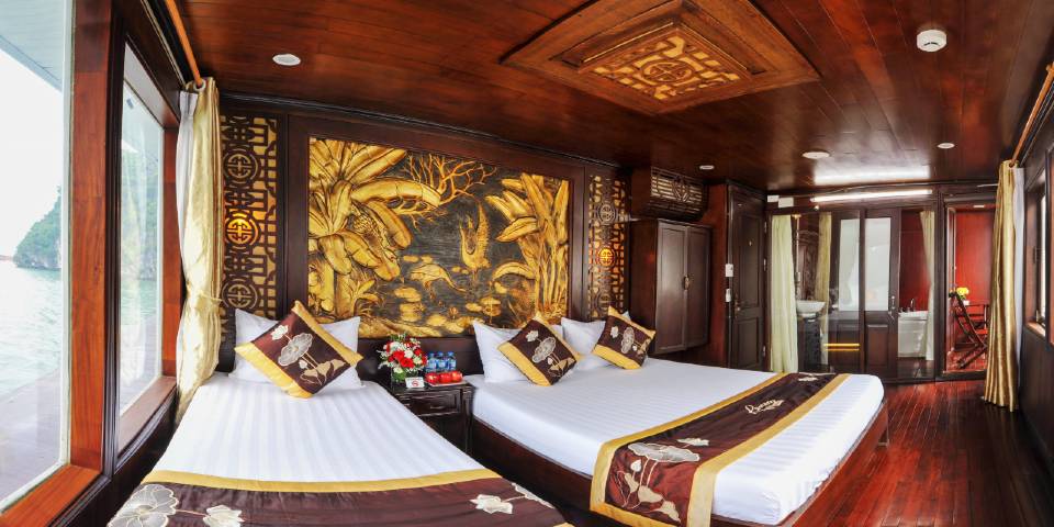 The Suite Cabins are perfect combination of color and illumination gives you an elegant stay plus inspiration about Bai Tu Long Bay. Located on 2nd floor, 22 – square meter and plus a private balcony right outside your bathroom. This cabin is ideal to spend the peaceful time of your own with a drink or enjoy the beautiful bay right from the jacuzzi..  Email:reneacruise@impresstravel.com & call to Mr. Alex Impress Travel, Bai Tu Long Bay Tours, Bai Tu Long Bay Cruises & Renea Cruise Manager at his cell-phone (+84) 9123 79 189 ​