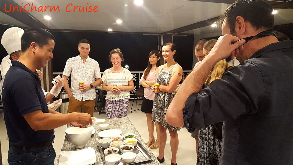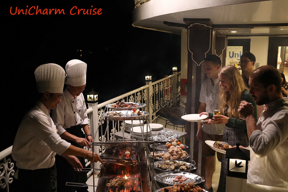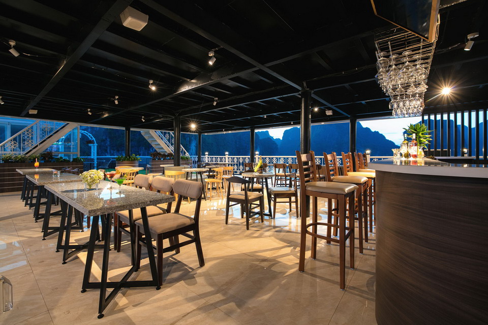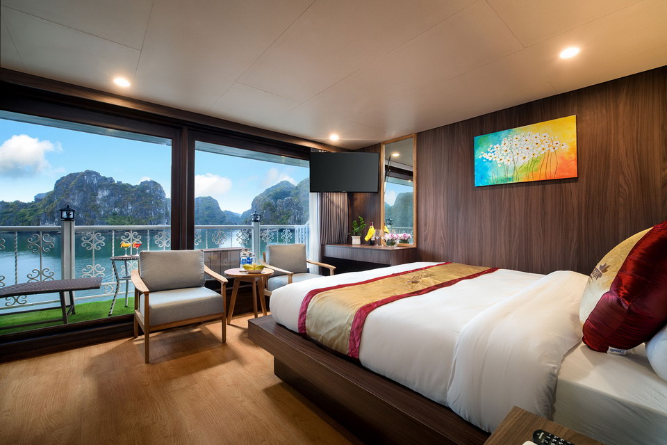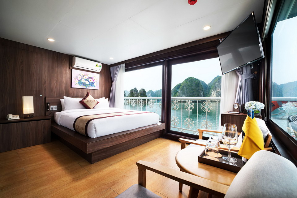 CHARM TERRACE: Room description: Quantity: 04 cabins, Location: 2nd and 3rd deck, Size: 30 square meters, Bed Type: Double. Maximum Occupancy: 2 Adults, 1 Child. Each cabin has a private terrace, floor-to-ceiling window with ocean view, bathroom with standing shower, and possible for putting extra bed. FAMILY CONNECTING: Room description: Quantity: 03 cabins, Location: 2nd and 3rd deck, Size: 50 – 60 square meters. Bed Type: 2 double beds or 1 Double bed & 2 single beds. Maximum Occupancy: 4 Adults, 2 Children (If you in a group of 5 adults, we will add an extra bed). Each Cabin has a private terrace, Floor-to-ceiling window with ocean view, 2 bathrooms with standing showers and possible for putting extra bed.