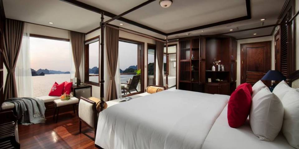 The high ceilings and full panoramic ocean views, the hand-painted mosaic tiles, the original paintings, the four-poster colonial bed at the center of each suite. It all combines to deliver an enticing blend of authentic classical charms of French Indochina with elegant Vietnamese themes for a unique and authentic stay.The luxuious cabins of Heritage Cruise Lan Ha Bay such as Delta Suites, Ocean Suites, Captain Suites and Regal Suites.
